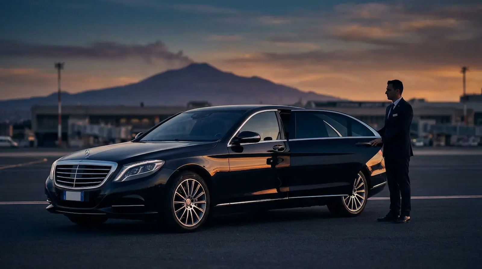 Black chauffeur car at Catania Airport with Mount Etna in the background